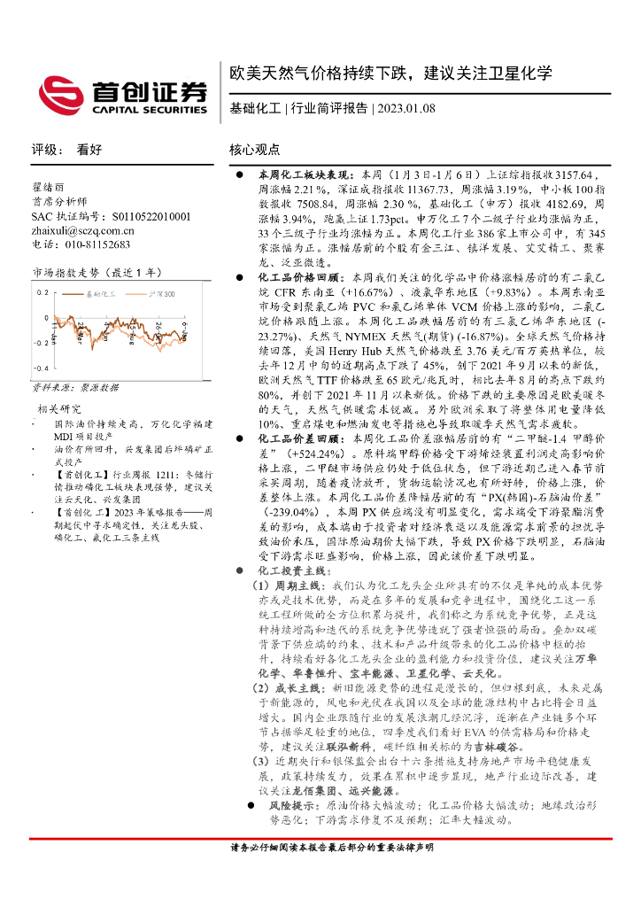 首创证券:基础化工行业简评报告:欧美天然气价格持续下跌,建议关注卫星化学.pdf