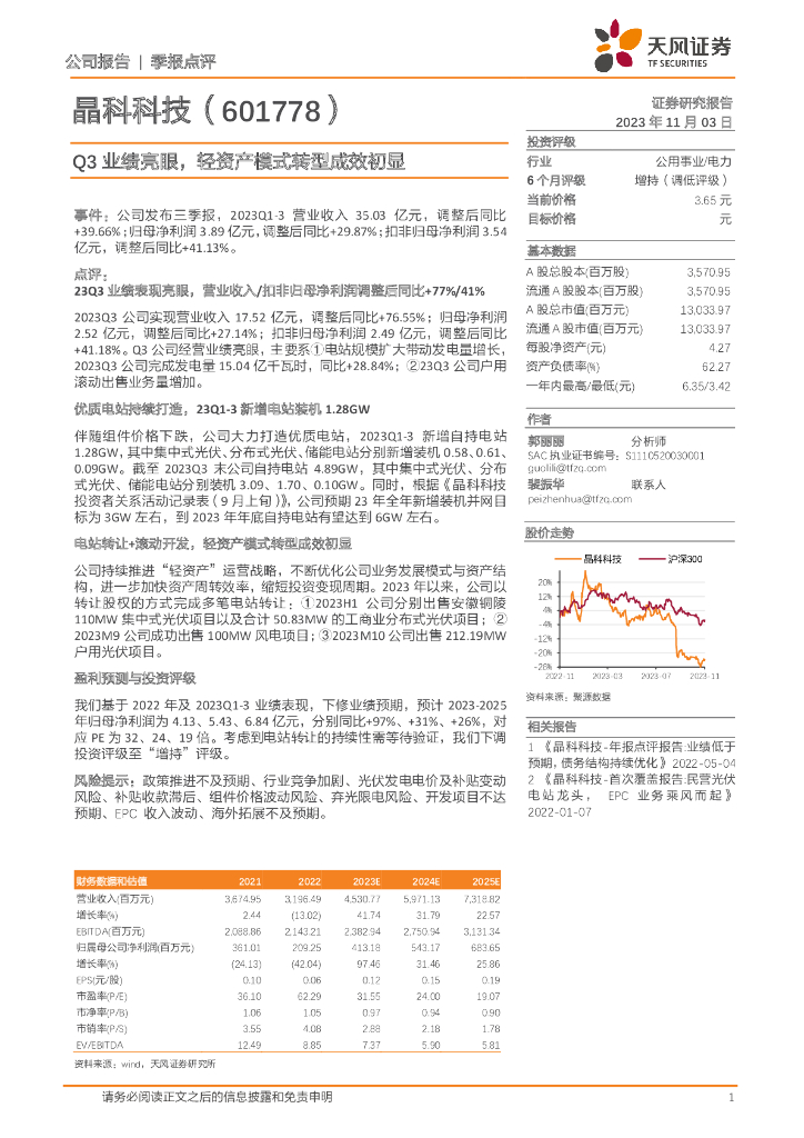 天风证券:晶科科技(601778)-Q3业绩亮眼,轻资产模式转型成效初显.pdf