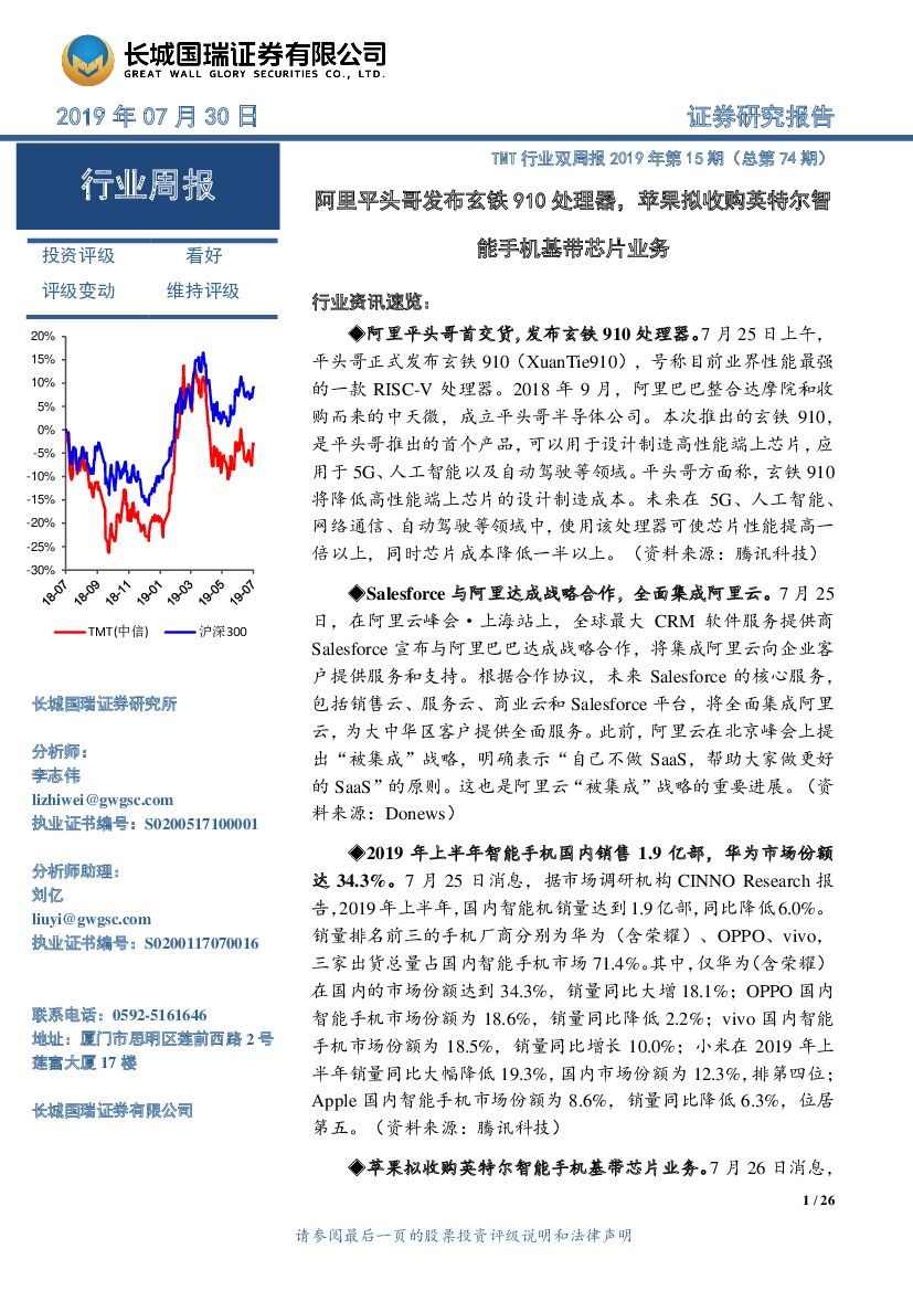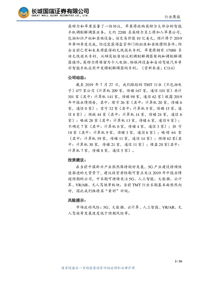 长城国瑞证券:TMT行业双周报2019年第15期(总第74期):阿里平头哥发布玄铁910处理器,苹果拟收购英特尔智能手机基带芯片业务.pdf