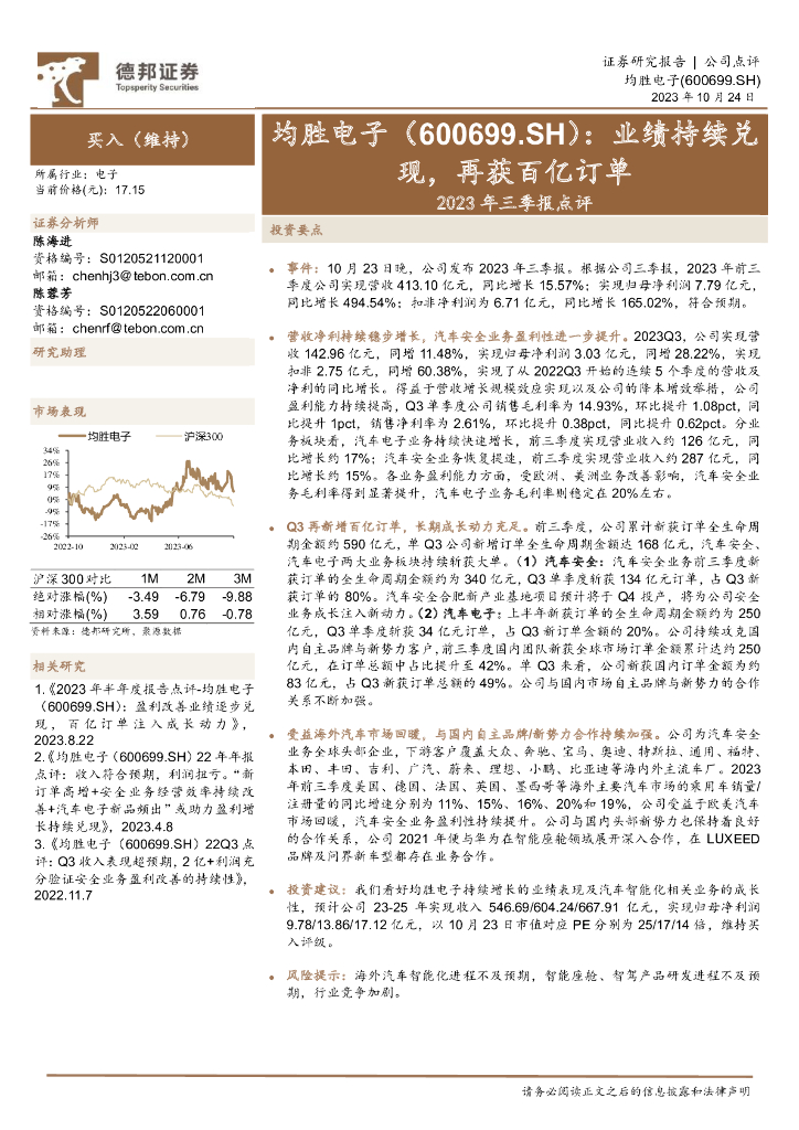 德邦证券:均胜电子(600699)-2023年三季报点评:业绩持续兑现,再获百亿订单.pdf