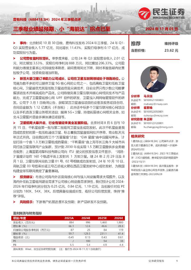 民生证券:震有科技(688418)-2024年三季报点评:三季报业绩超预期,小“海能达”拐点已至.pdf