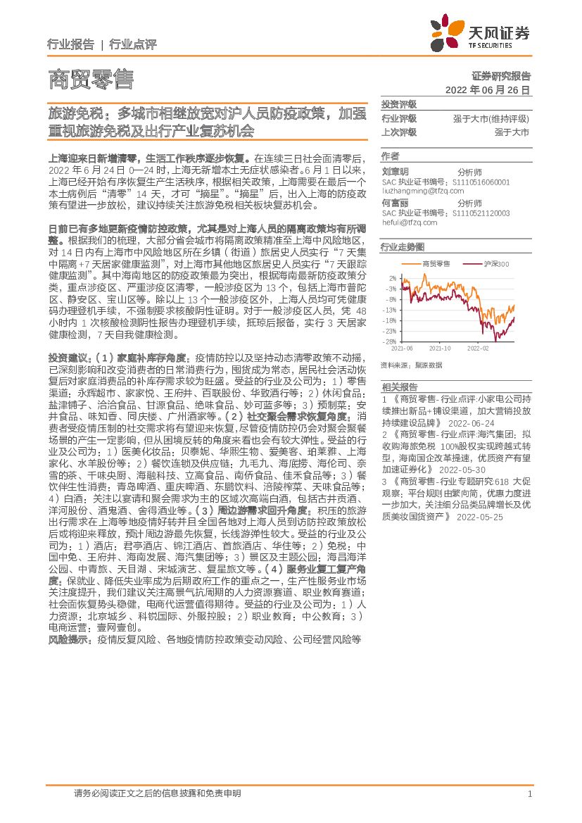 天风证券:商贸零售旅游免税:多城市相继放宽对沪人员防疫政策,加强重视旅游免税及出行产业复苏机会.pdf