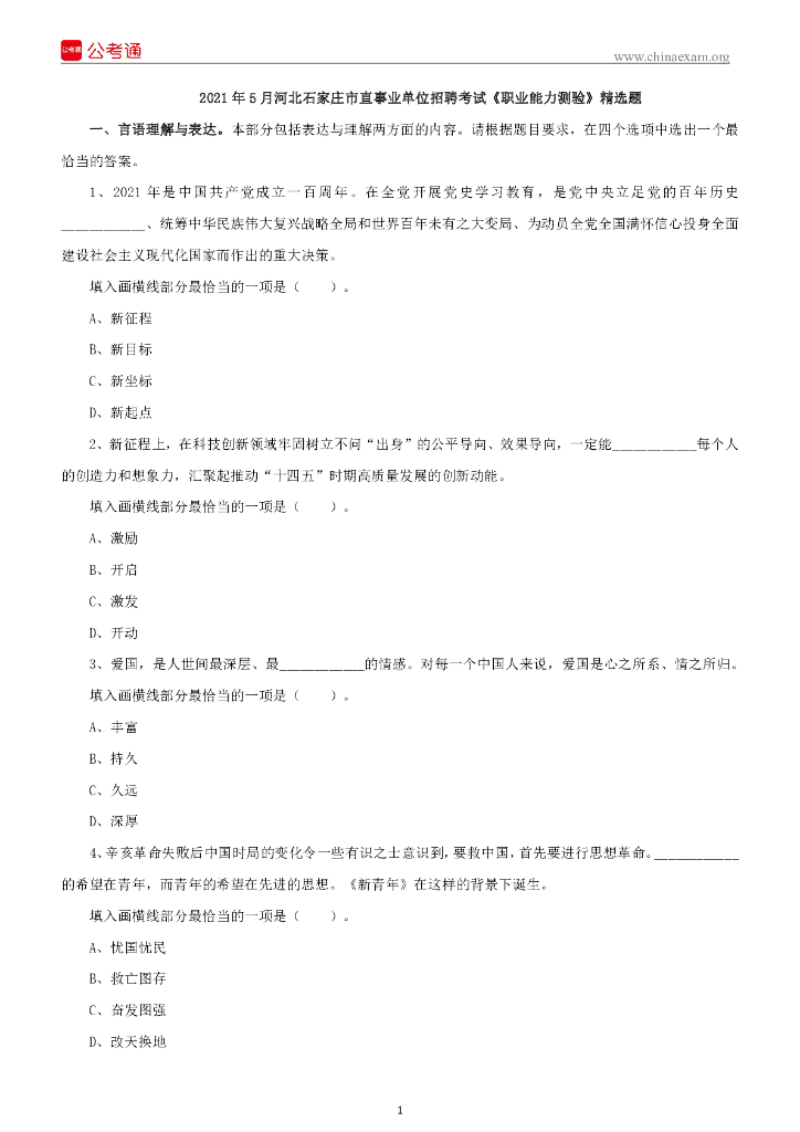 2021年5月河北石家庄市直事业单位招聘考试《职业能力测验》精选题.pdf