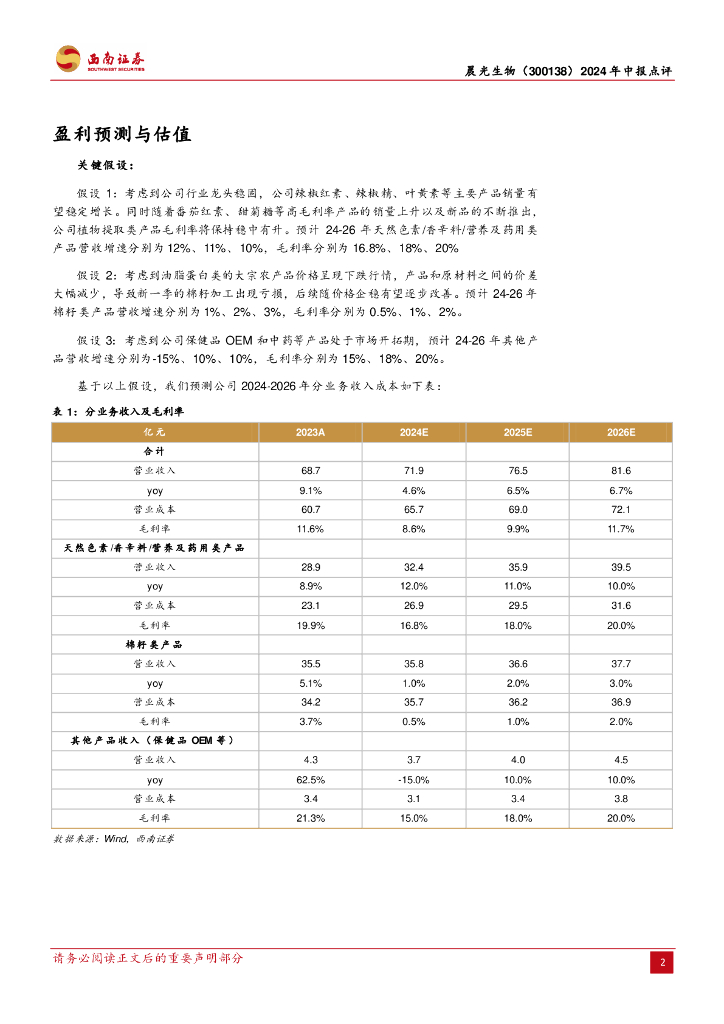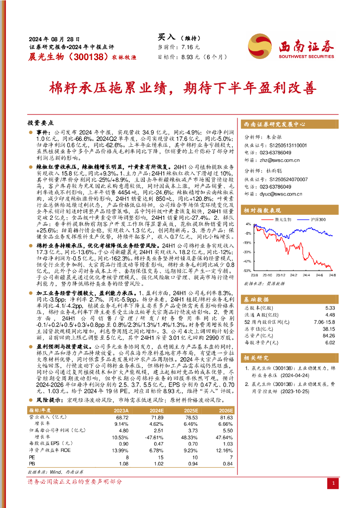 西南证券:晨光生物(300138)-2024年中报点评:棉籽承压拖累业绩,期待下半年盈利改善.pdf