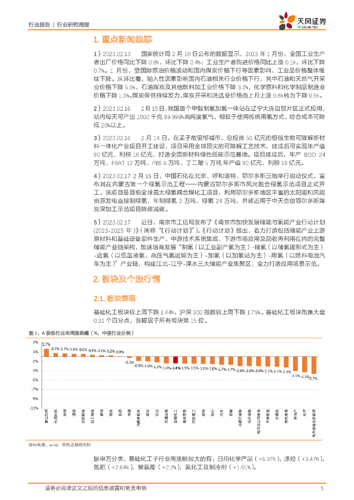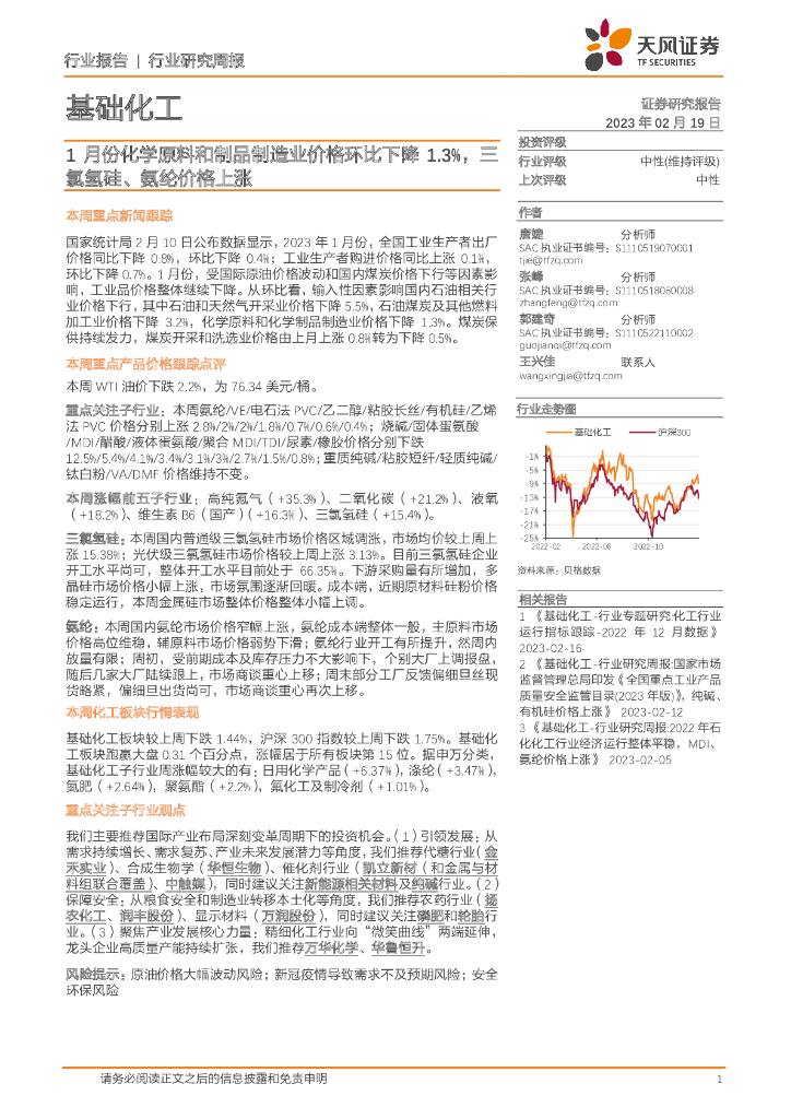 天风证券:基础化工行业研究周报:1月份化学原料和制品制造业价格环比下降1.3%,三氯氢硅、氨纶价格上涨.pdf