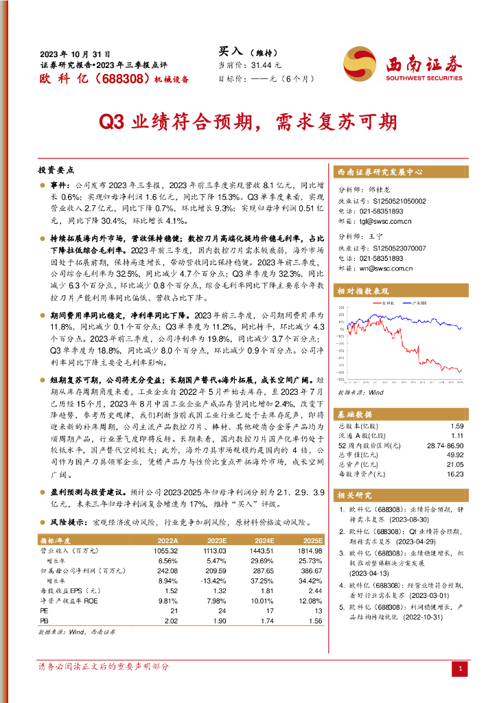 西南证券:欧科亿(688308)-2023年三季报点评:Q3业绩符合预期,需求复苏可期.pdf