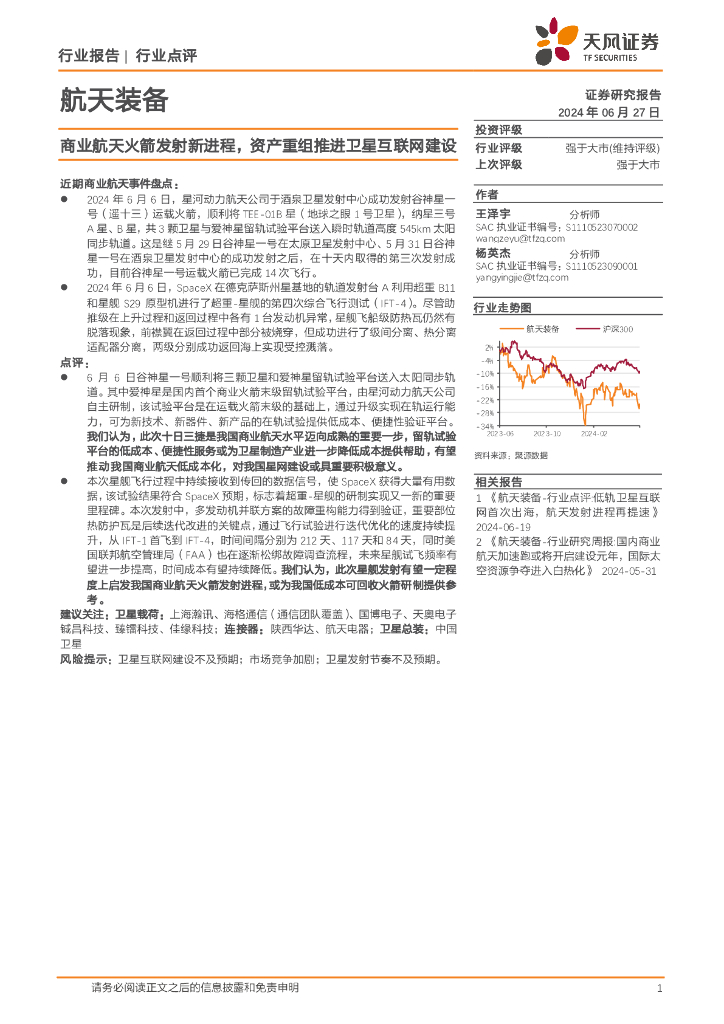 天风证券:航天装备行业点评:商业航天火箭发射新进程,资产重组推进卫星互联网建设.pdf