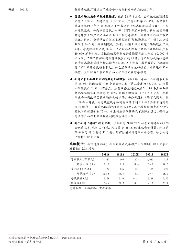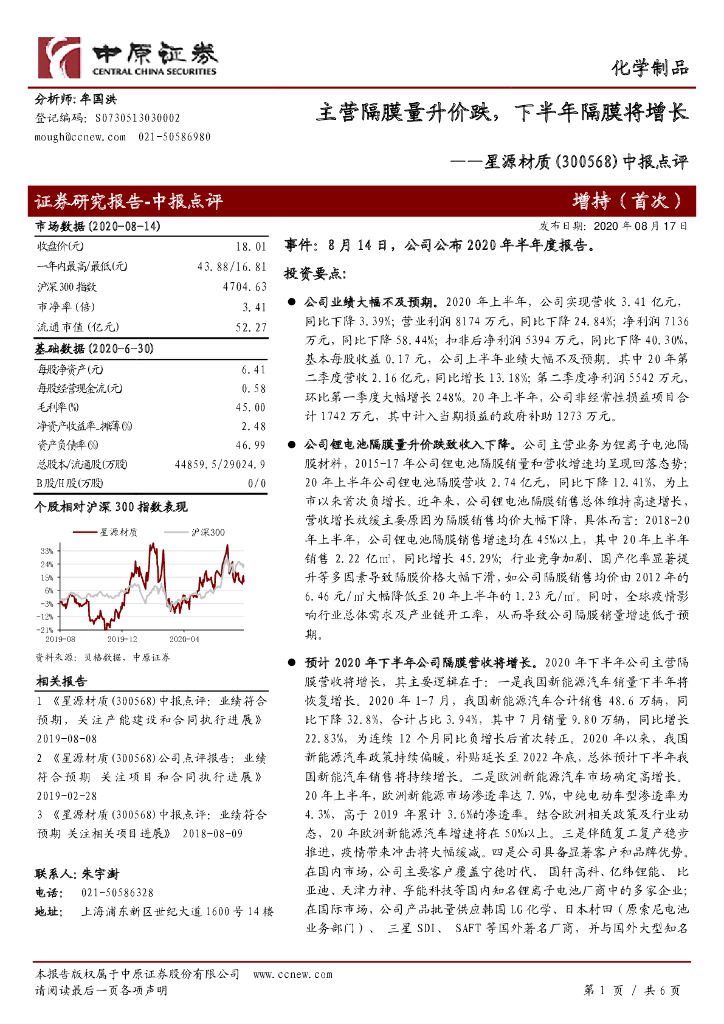 中原证券:星源材质(300568)-中报点评:主营隔膜量升价跌,下半年隔膜将增长.pdf