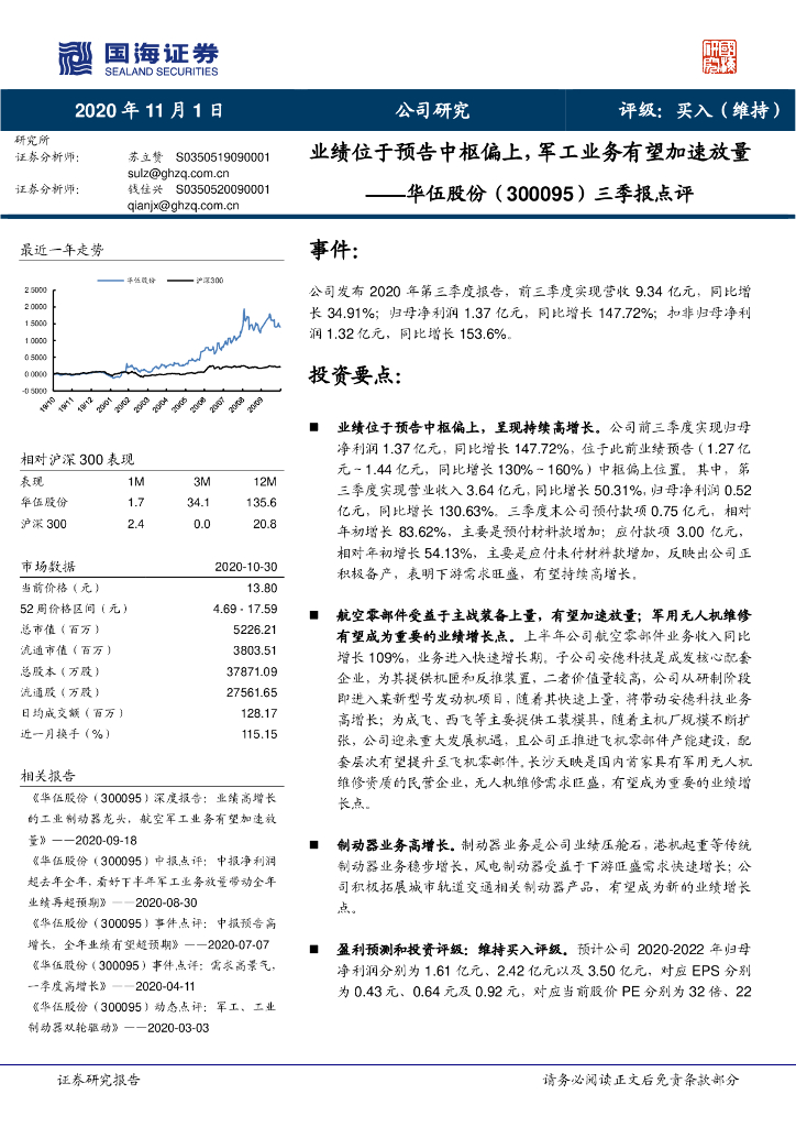 国海证券:华伍股份(300095)-三季报点评:业绩位于预告中枢偏上,军工业务有望加速放量.pdf