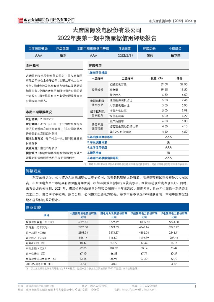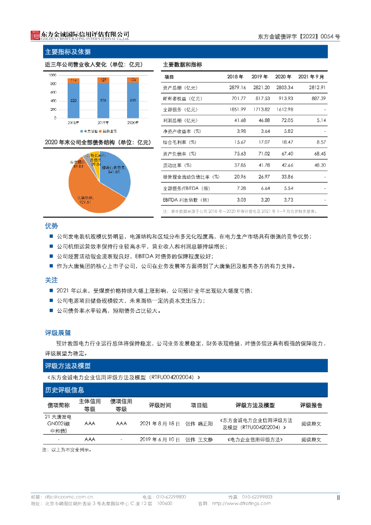 东方金诚:大唐国际发电股份有限公司2022年度第一期中期票据信用评级报告及跟踪评级安排(更新).pdf