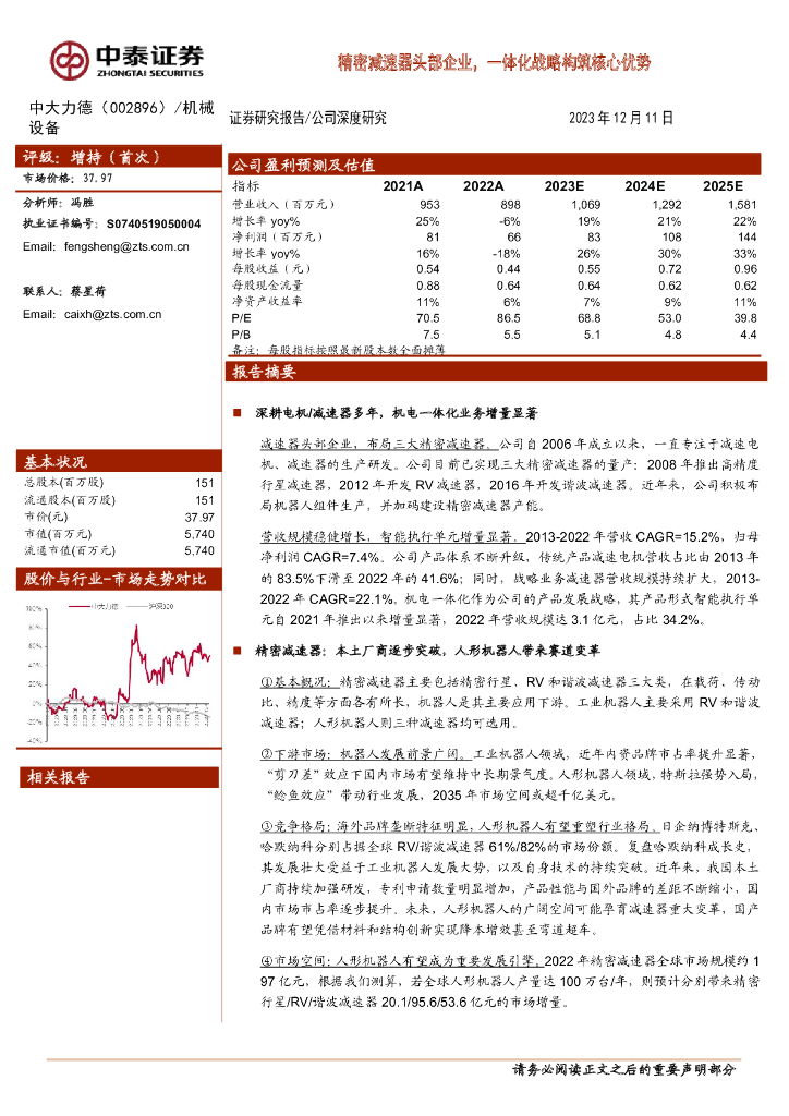 中泰证券:中大力德(002896)-精密减速器头部企业,一体化战略构筑核心优势.pdf