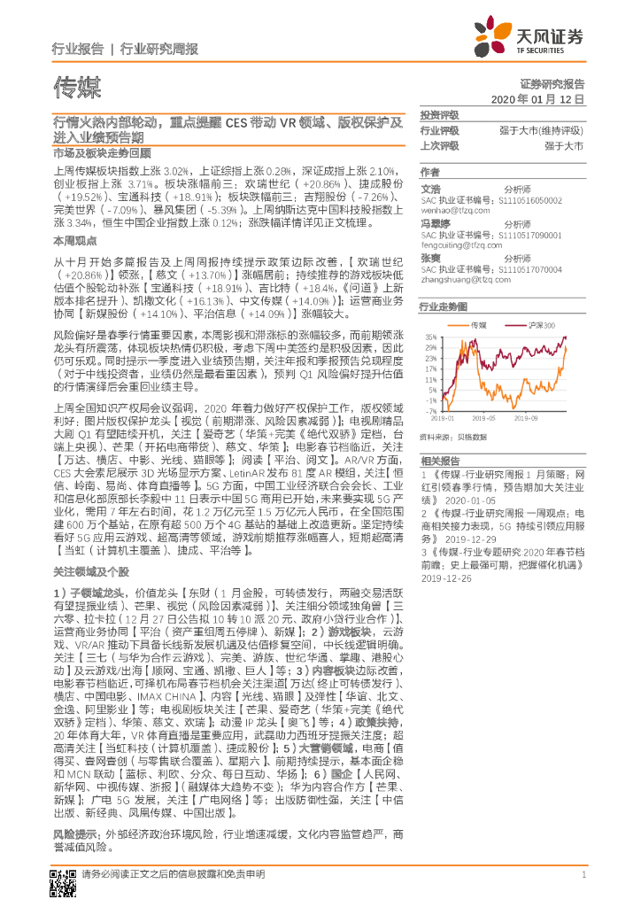 天风证券:传媒行业研究周报:行情火热内部轮动,重点提醒CES带动VR领域、版权保护及进入业绩预告期.pdf