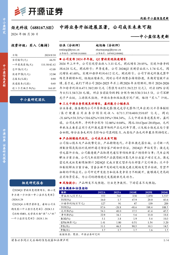 开源证券:炬光科技(688167)-中小盘信息更新:中游业务开拓进展显著,公司成长未来可期.pdf