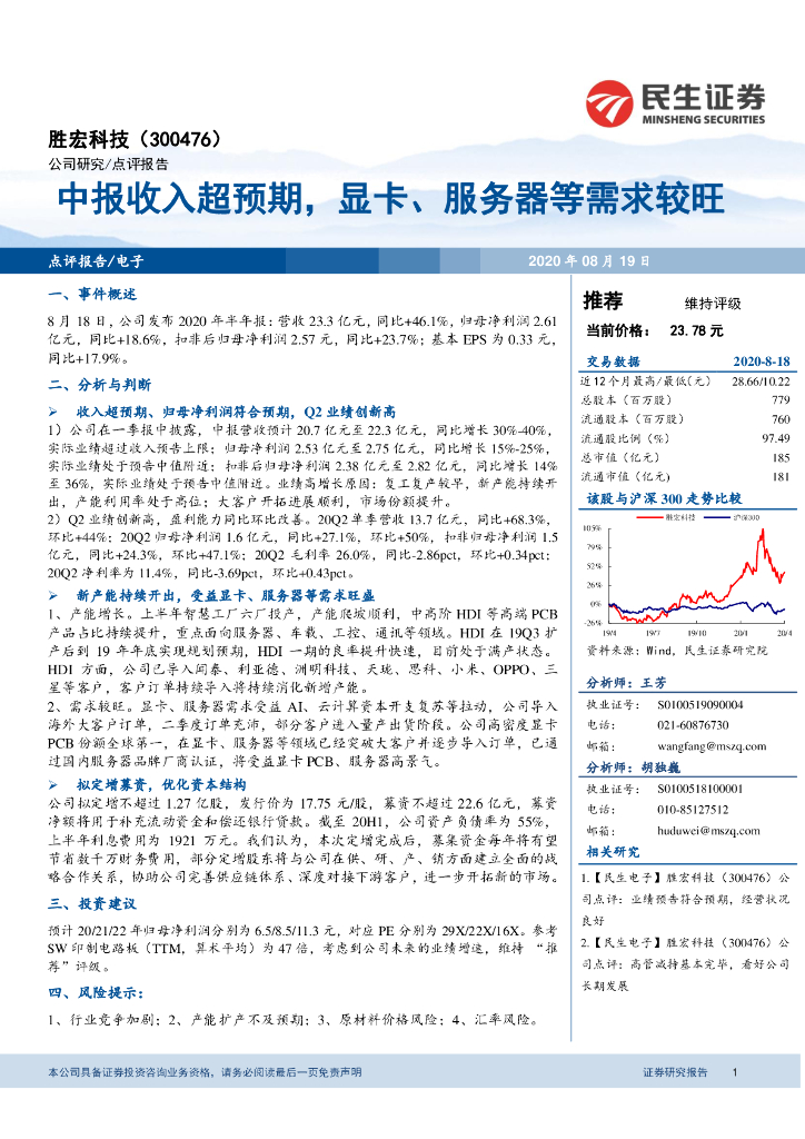 民生证券:胜宏科技(300476)-中报收入超预期,显卡、服务器等需求较旺.pdf