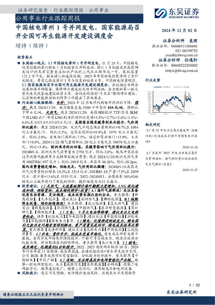 东吴证券:公用事业行业跟踪周报:中国核电漳州1号并网发电,国家能源局召开全国可再生能源开发建设调度会.pdf