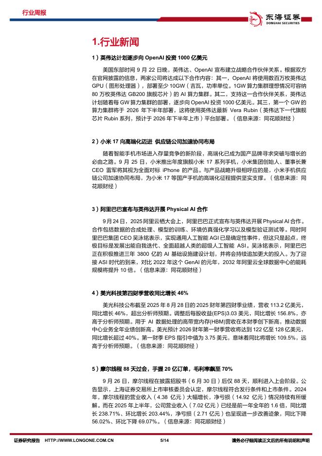 东海证券:电子行业周报:英伟达拟向OpenAI投资1000亿美元,小米召开多品类新品发布会.pdf