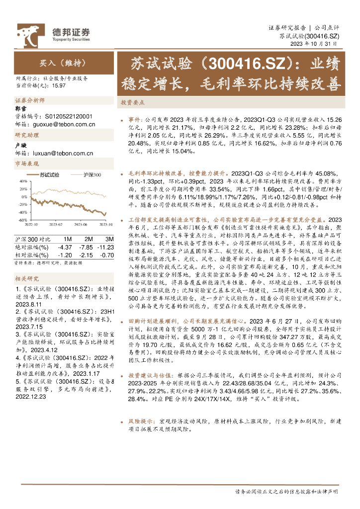 德邦证券:苏试试验(300416)-业绩稳定增长,毛利率环比持续改善.pdf
