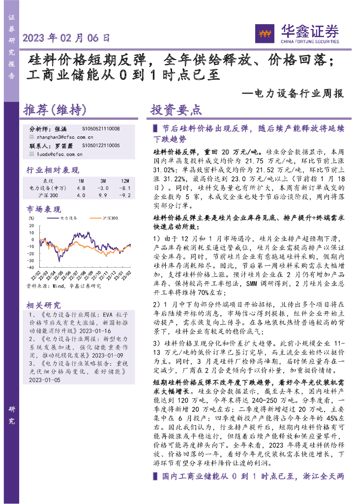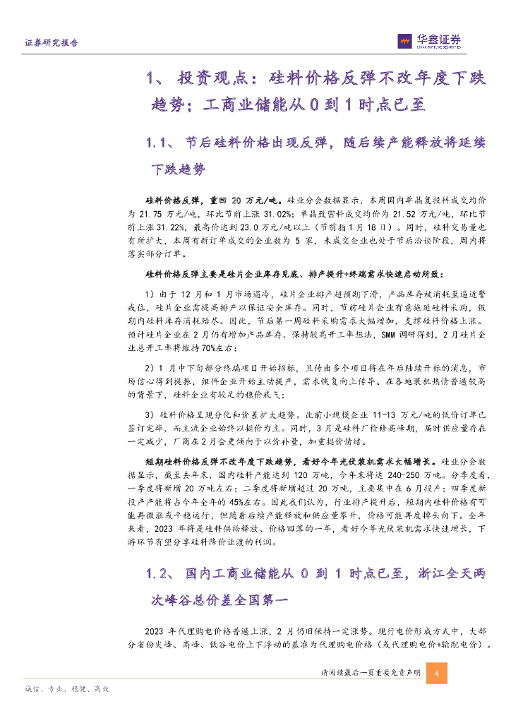 华鑫证券:电力设备行业周报:硅料价格短期反弹,全年供给释放、价格回落;工商业储能从0到1时点已至.pdf