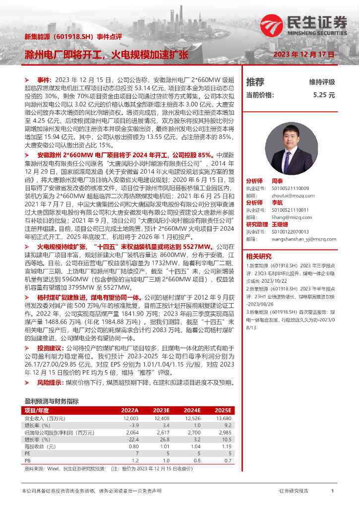 民生证券:新集能源(601918)-事件点评:滁州电厂即将开工,火电规模加速扩张.pdf