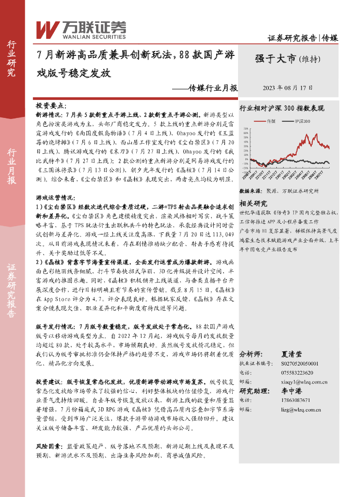 万联证券:传媒行业月报:7月新游高品质兼具创新玩法,88款国产游戏版号稳定发放.pdf