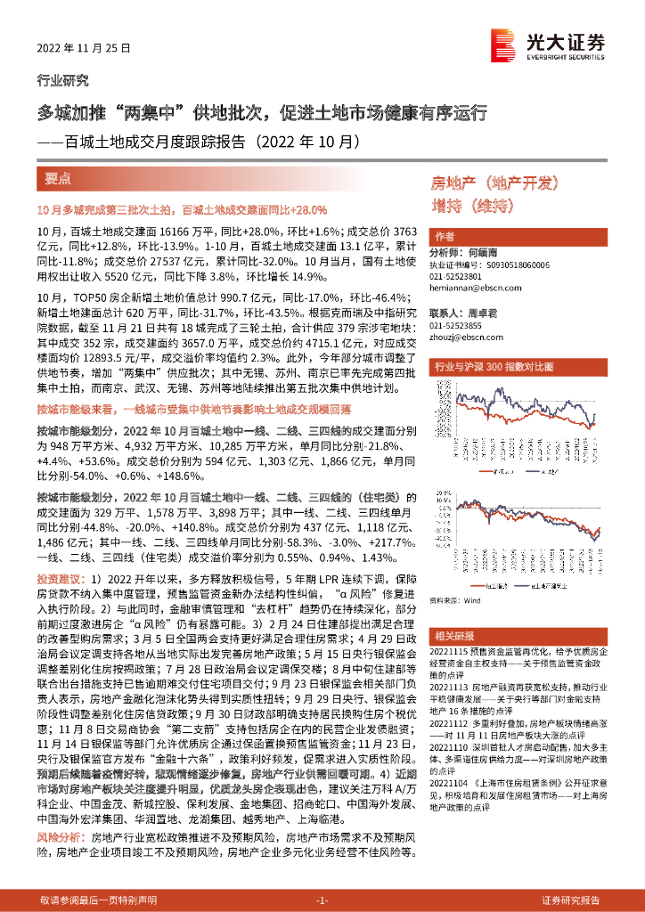 光大证券:房地产(地产开发):百城土地成交月度跟踪报告(2022年10月)-多城加推“两集中”供地批次,促进土地市场健康有序运行.pdf