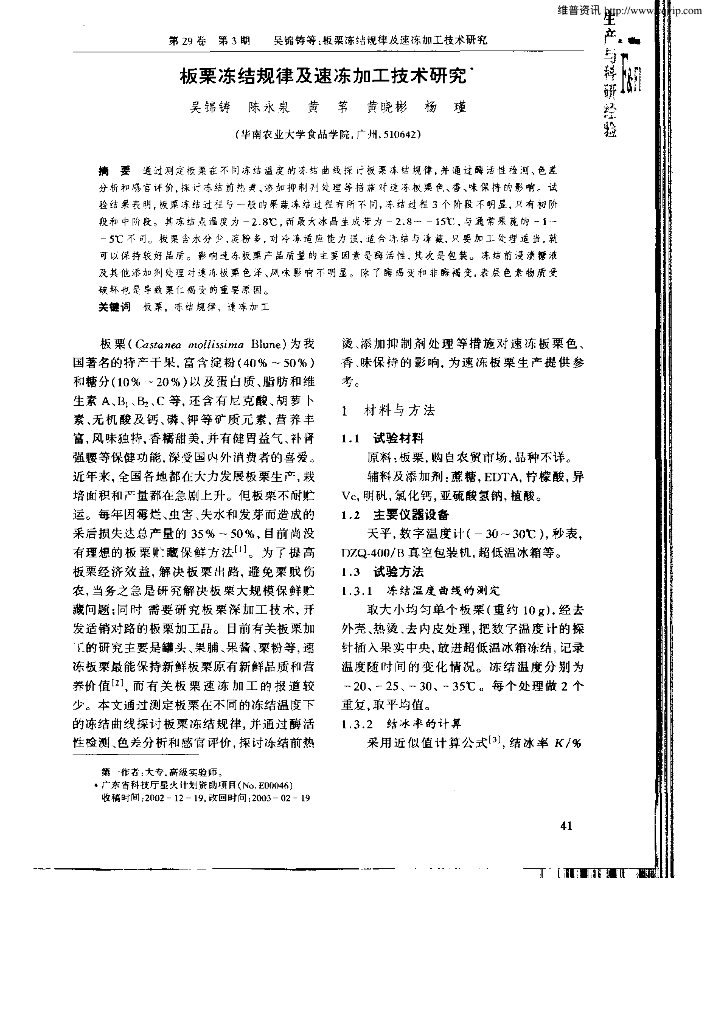 《食品工程单元操作》文献资料-板栗冻结规律及速冻加工技术研究.pdf