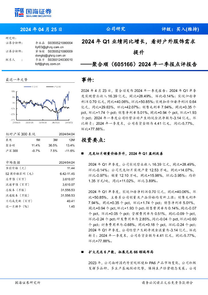 国海证券:聚合顺(605166)-2024年一季报点评报告:2024年Q1业绩同比增长,看好户外服饰需求提升.pdf