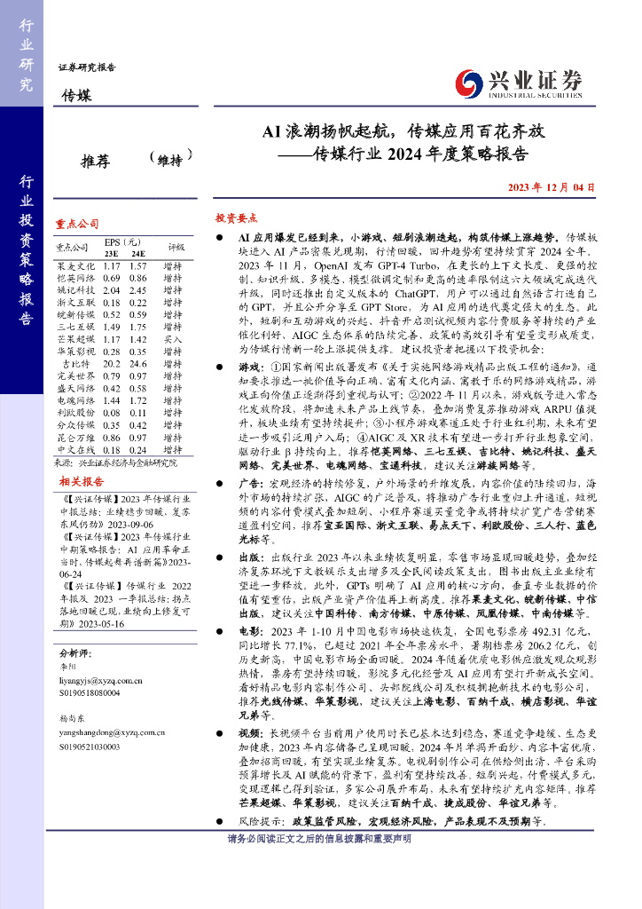 兴业证券:传媒行业2024年度策略报告:AI浪潮扬帆起航,传媒应用百花齐放.pdf