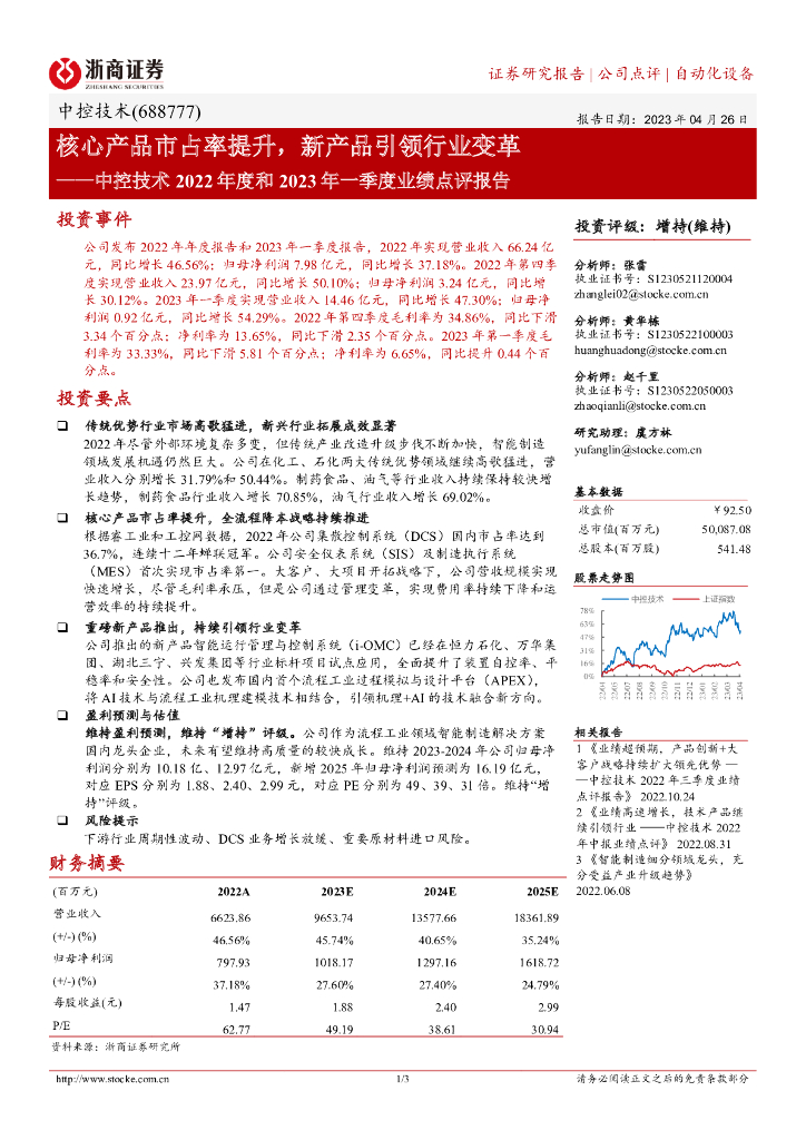 浙商证券:中控技术2022年度和2023年一季度业绩点评报告:核心产品市占率提升,新产品引领行业变革.pdf