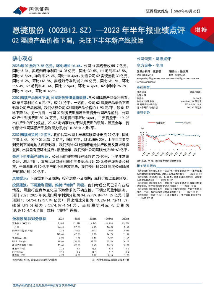 国信证券:恩捷股份(002812)-2023年半年报业绩点评:Q2隔膜产品价格下调,关注下半年新产线投运.pdf