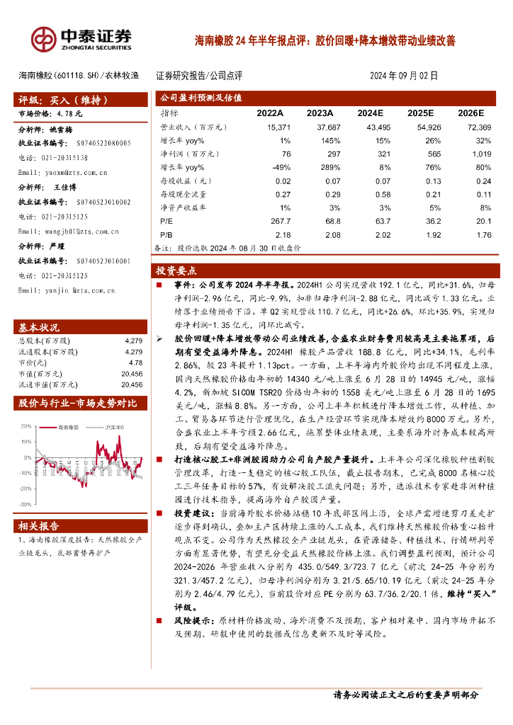 中泰证券:海南橡胶24年半年报点评:胶价回暖+降本增效带动业绩改善.pdf