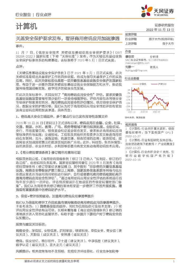 天风证券:计算机:关基安全保护要求发布,看好商用密码应用加速渗透.pdf