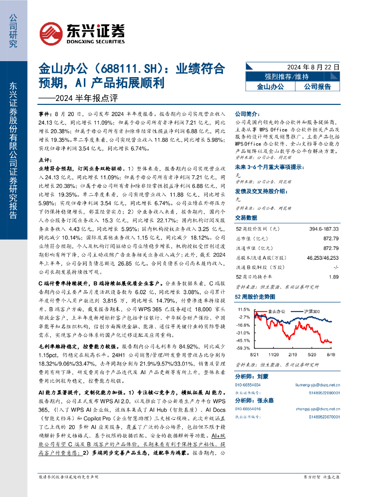 东兴证券:金山办公(688111)-2024半年报点评:业绩符合预期,AI产品拓展顺利.pdf