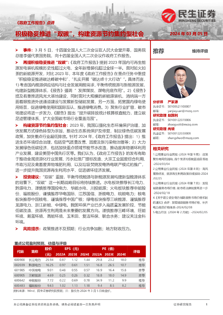 民生证券:电力及公用事业《政府工作报告》点评:积极稳妥推进“双碳”,构建资源节约集约型社会.pdf