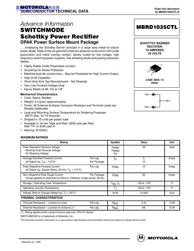 MOTOROLA Semiconductor MBRD1035CTL 数据手册.pdf