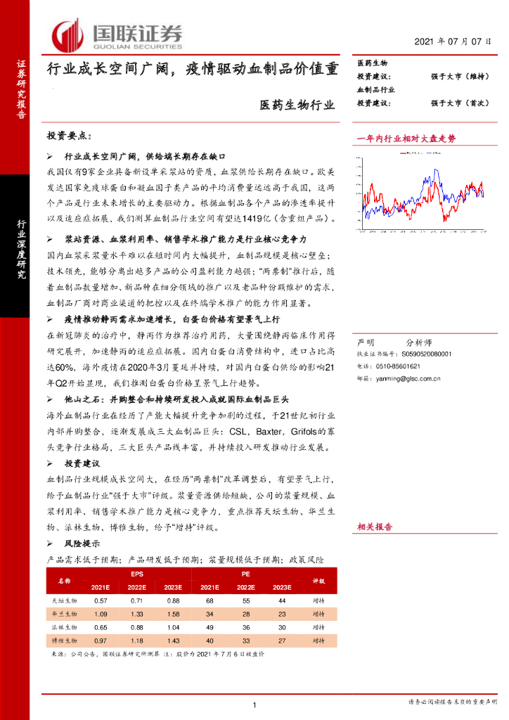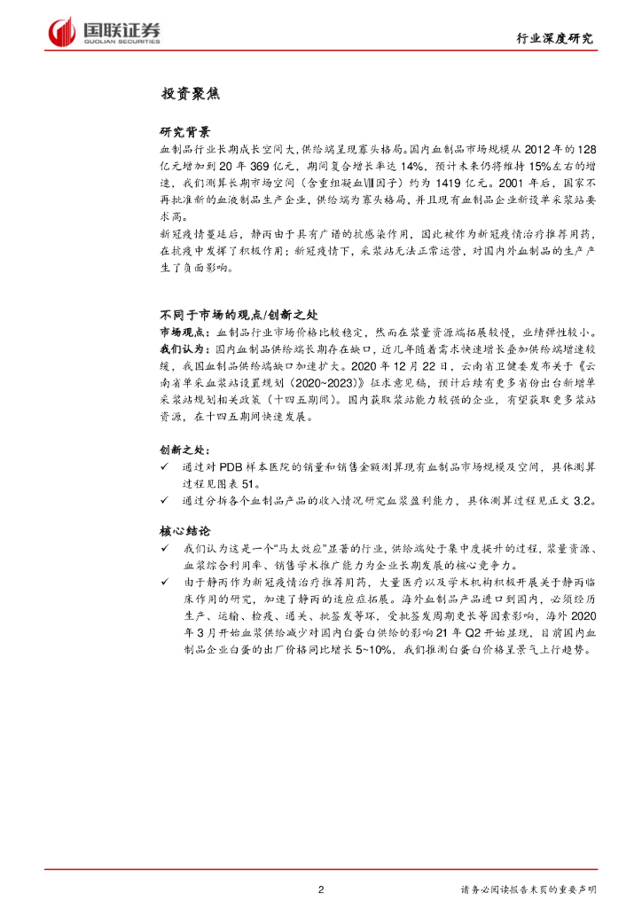 国联证券:医药生物行业——行业成长空间广阔,疫情驱动血制品价值重估.pdf