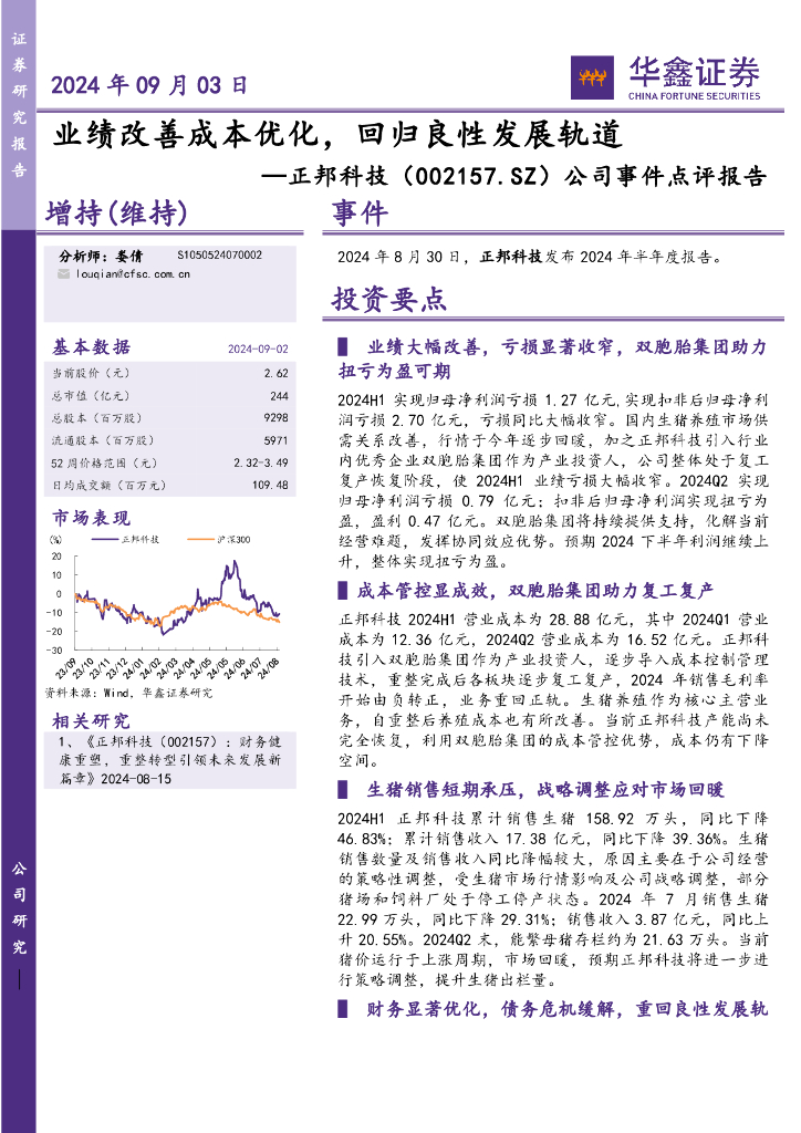 华鑫证券:正邦科技(002157)-公司事件点评报告:业绩改善成本优化,回归良性发展轨道.pdf