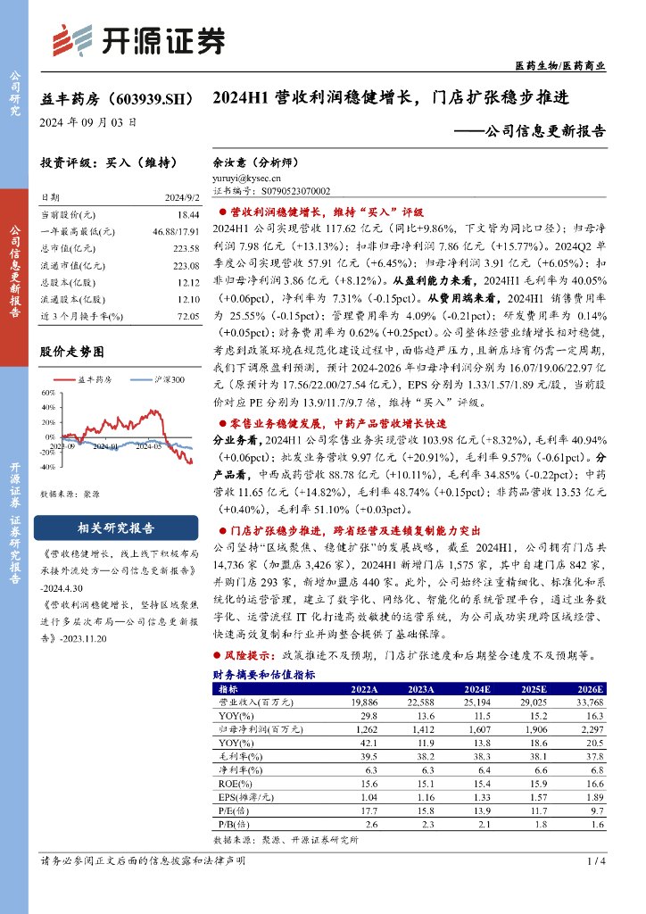 开源证券:益丰药房(603939)-公司信息更新报告:2024H1营收利润稳健增长,门店扩张稳步推进.pdf