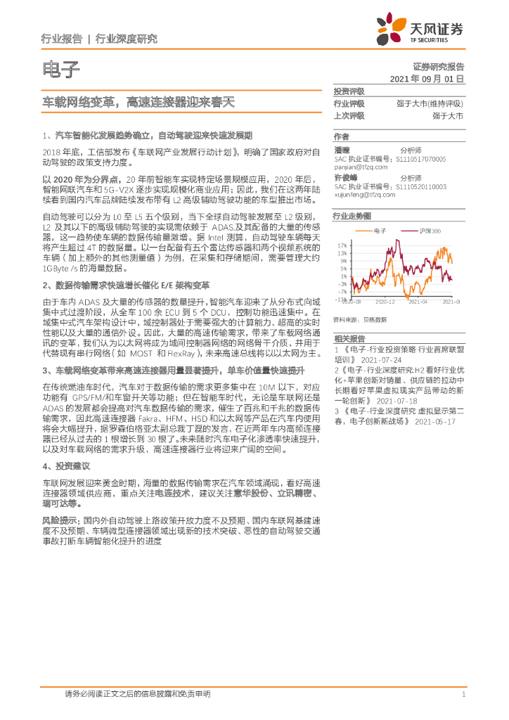 天风证券:电子行业深度研究:车载网络变革,高速连接器迎来春天.pdf