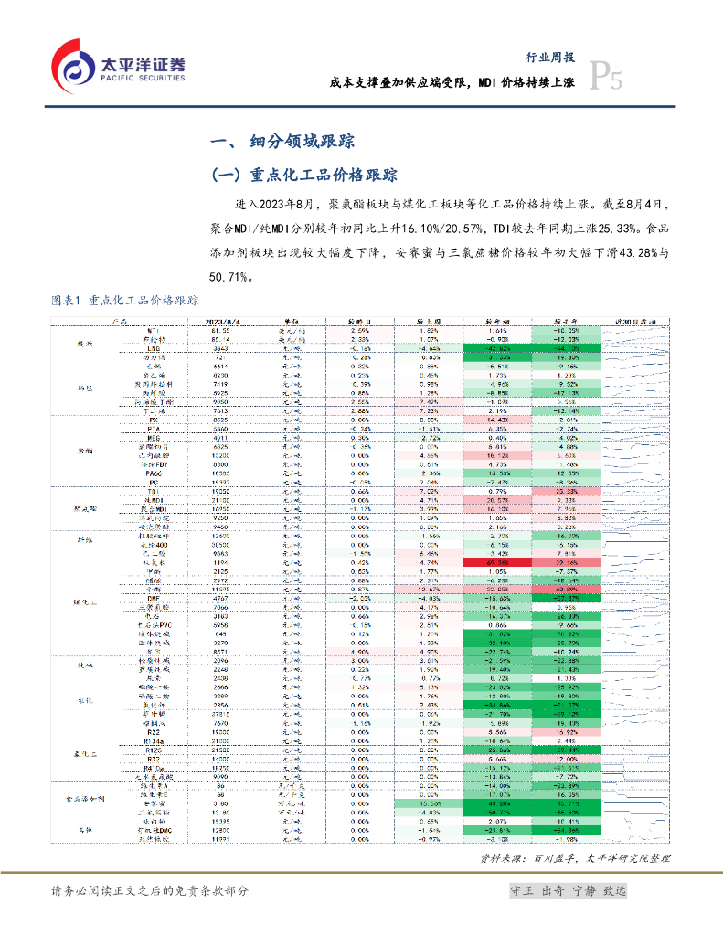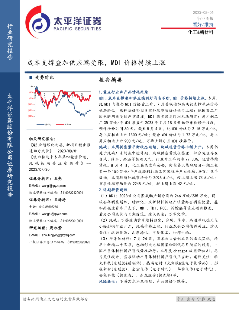 太平洋证券:化工&新材料行业周报:成本支撑叠加供应端受限,MDI价格持续上涨.pdf