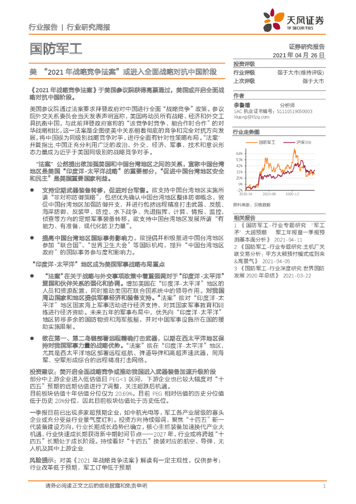 天风证券:国防军工行业研究周报:美“2021年战略竞争法案”或进入全面战略对抗中国阶段.pdf