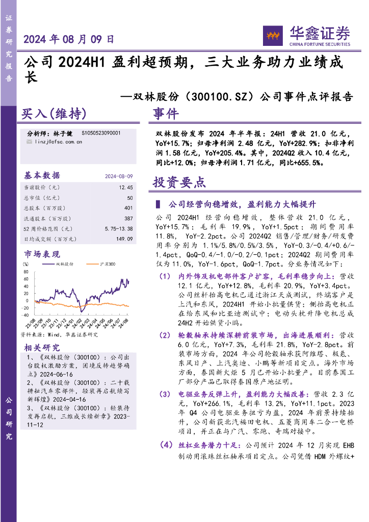 华鑫证券:双林股份(300100)-公司事件点评报告:公司2024H1盈利超预期,三大业务助力业绩成长.pdf