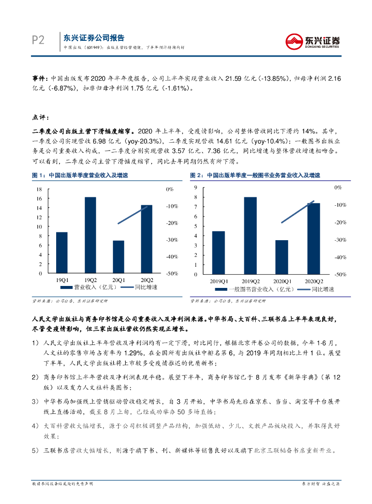 东兴证券:中国出版(601949)-出版主营经营稳健,下半年预计持续向好.pdf