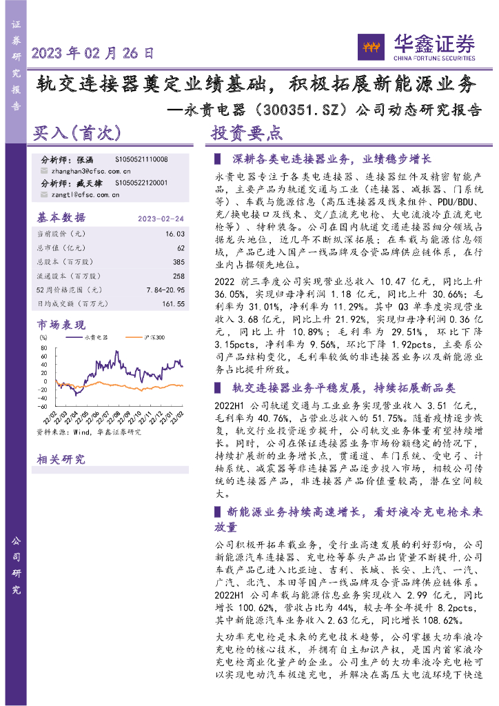 华鑫证券:永贵电器(300351)-公司动态研究报告:轨交连接器奠定业绩基础,积极拓展新能源业务.pdf