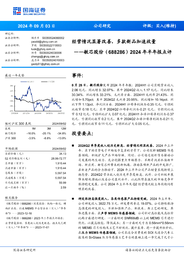 国海证券:敏芯股份(688286)-2024年半年报点评:经营情况显著改善,多款新品加速放量.pdf