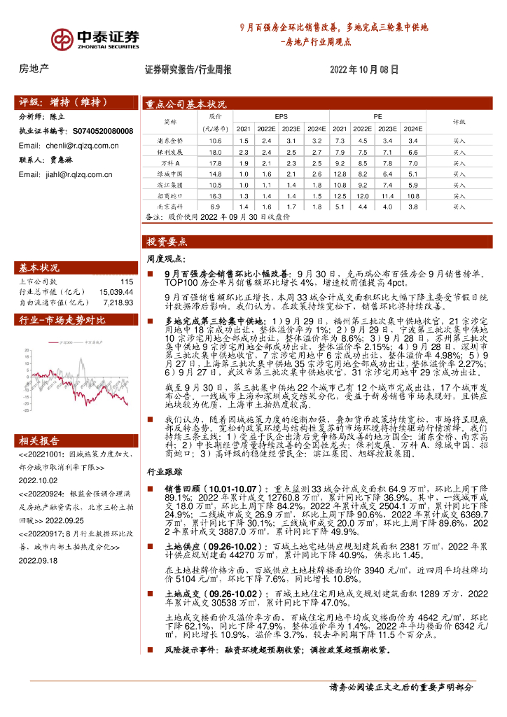 中泰证券:房地产行业周观点:9月百强房企环比销售改善,多地完成三轮集中供地.pdf