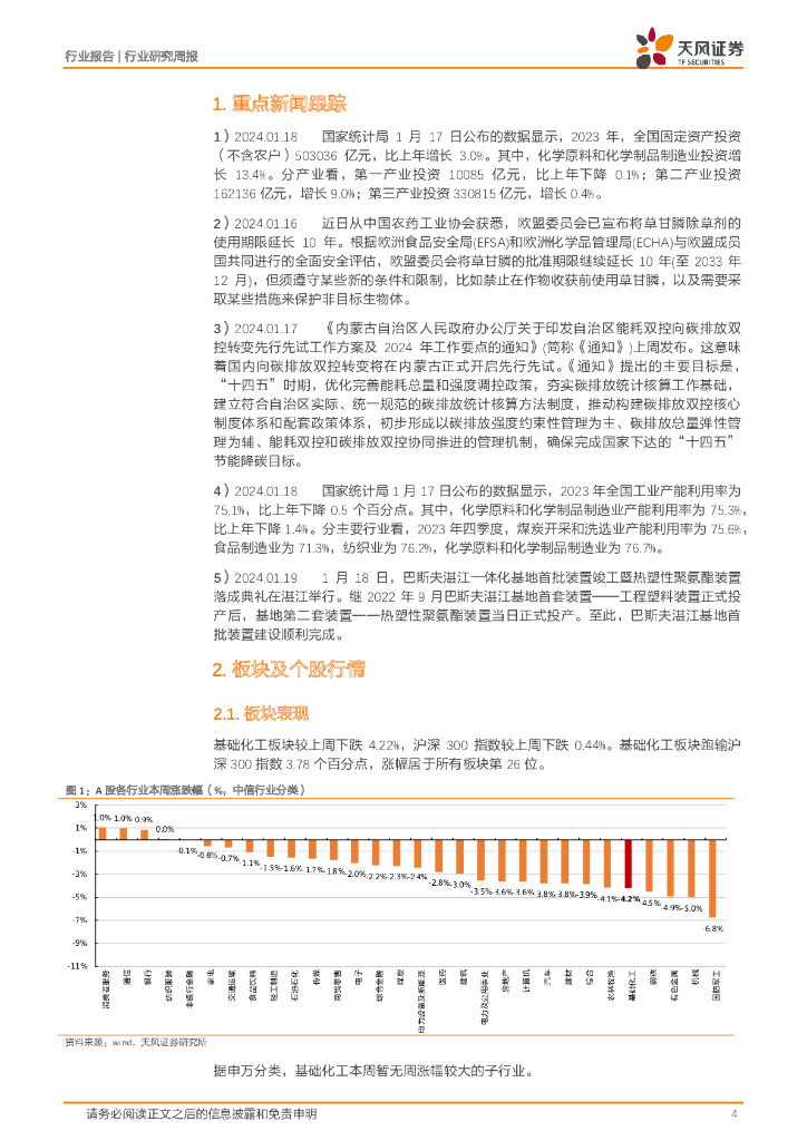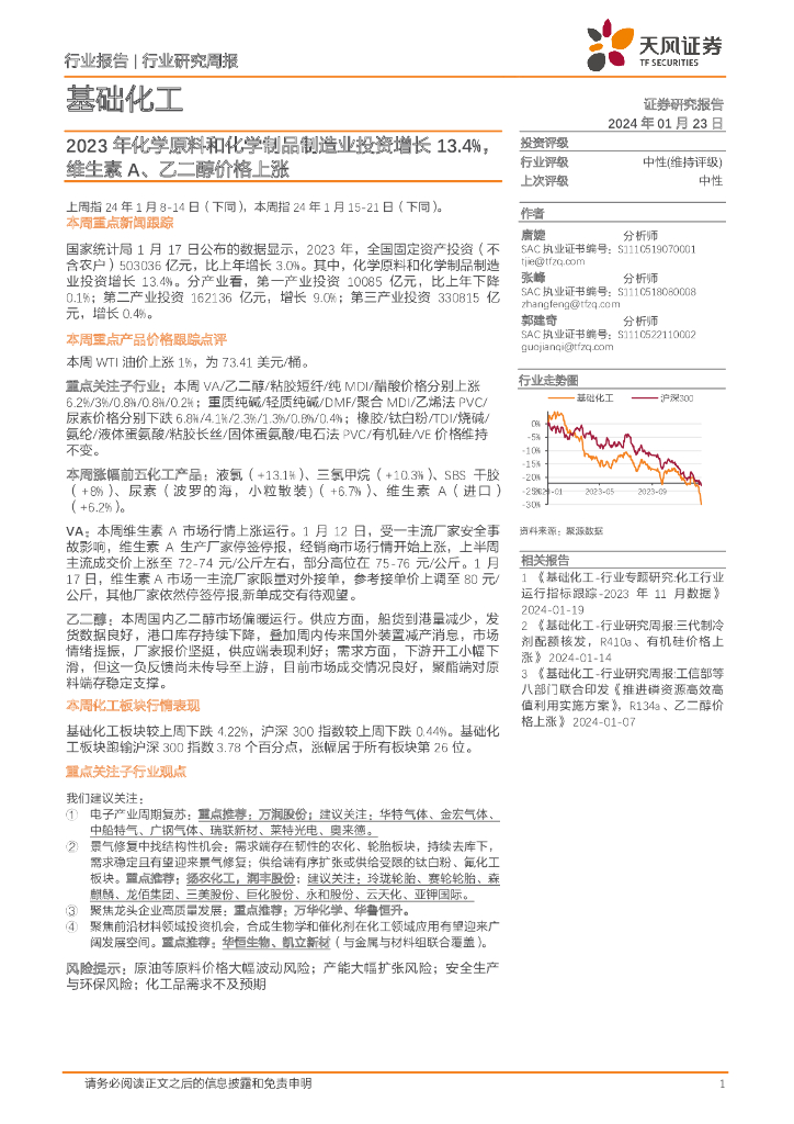 天风证券:基础化工行业研究周报:2023年化学原料和化学制品制造业投资增长13.4%,维生素A、乙二醇价格上涨.pdf