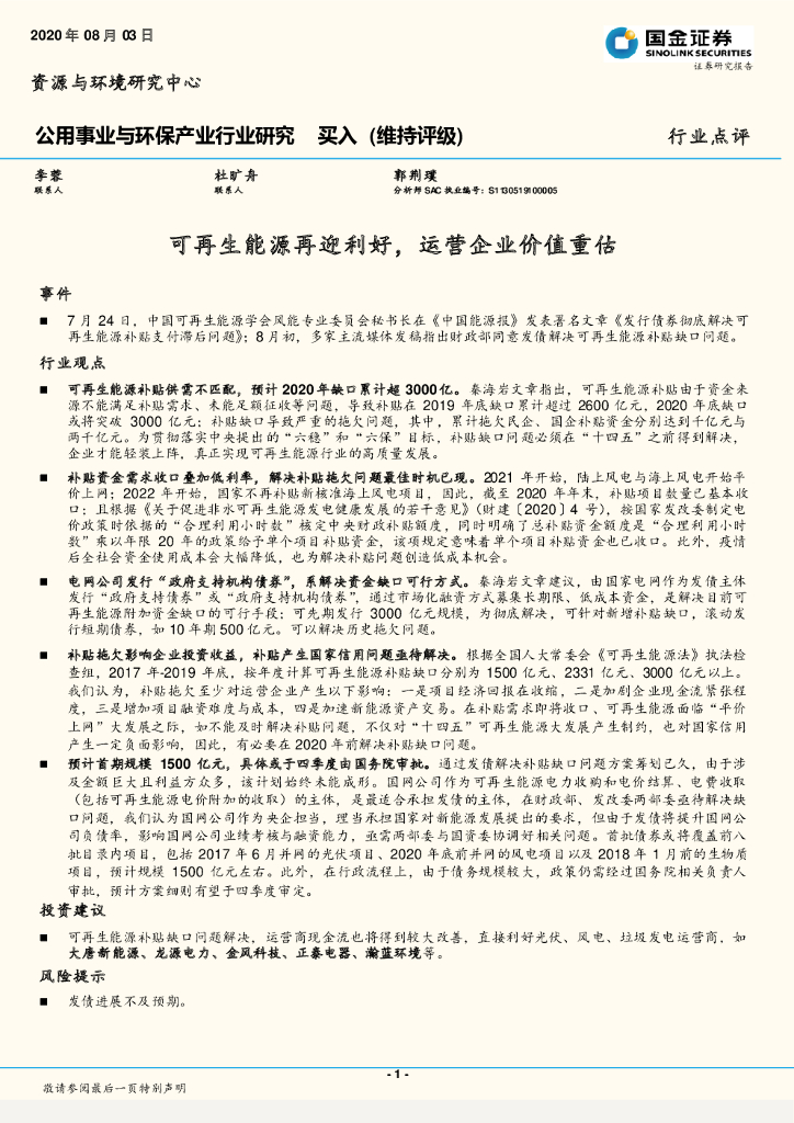 国金证券:公用事业与环保产业行业研究:可再生能源再迎利好,运营企业价值重估.pdf