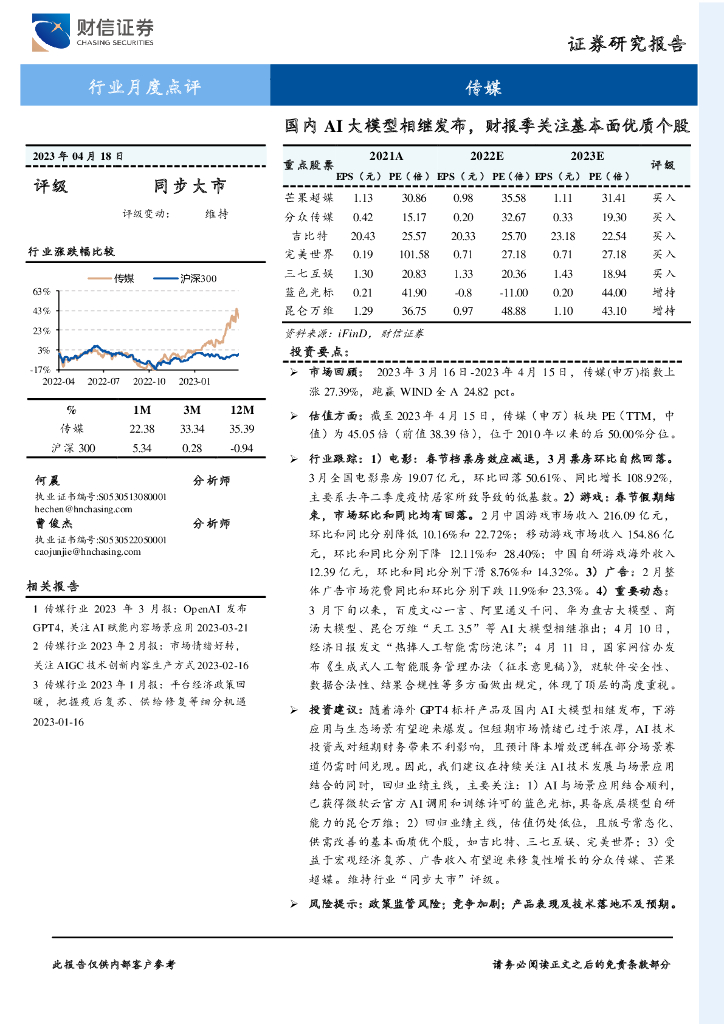 财信证券:传媒行业月度点评:国内AI大模型相继发布,财报季关注基本面优质个股.pdf