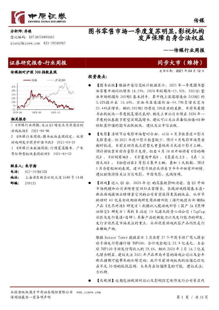 中原证券:传媒行业周报:图书零售市场一季度复苏明显,影视机构发声保障自身合法权益.pdf